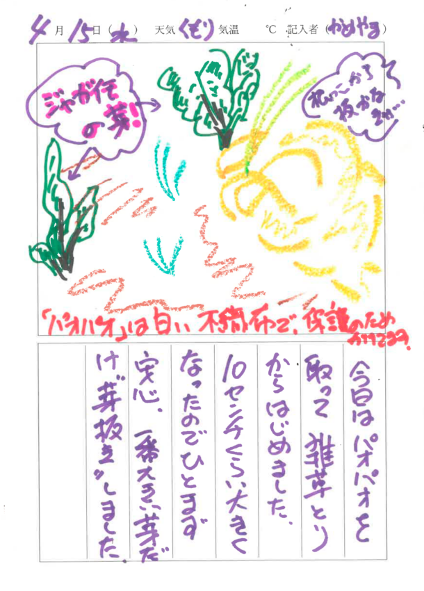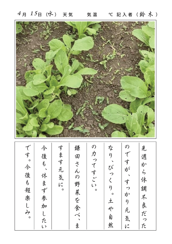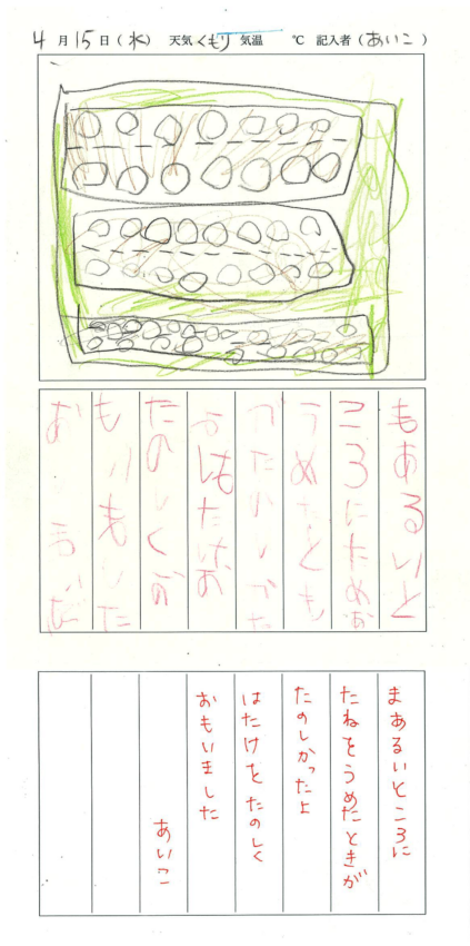 2026年4月15日 農園日記By Tohto-Tutor / 2026-04-16 日記① 日記② 日記③ 日記④ 今回の作業内容 小松菜、枝豆、とうもろこしの種まき 除草作業 畝のマルチはり 兼田さんより「都市農業を感じ、考える」ミニ学習 近隣生産者の小松菜、ほうれん草、菜花 収穫体験(※希望者のみの参加)